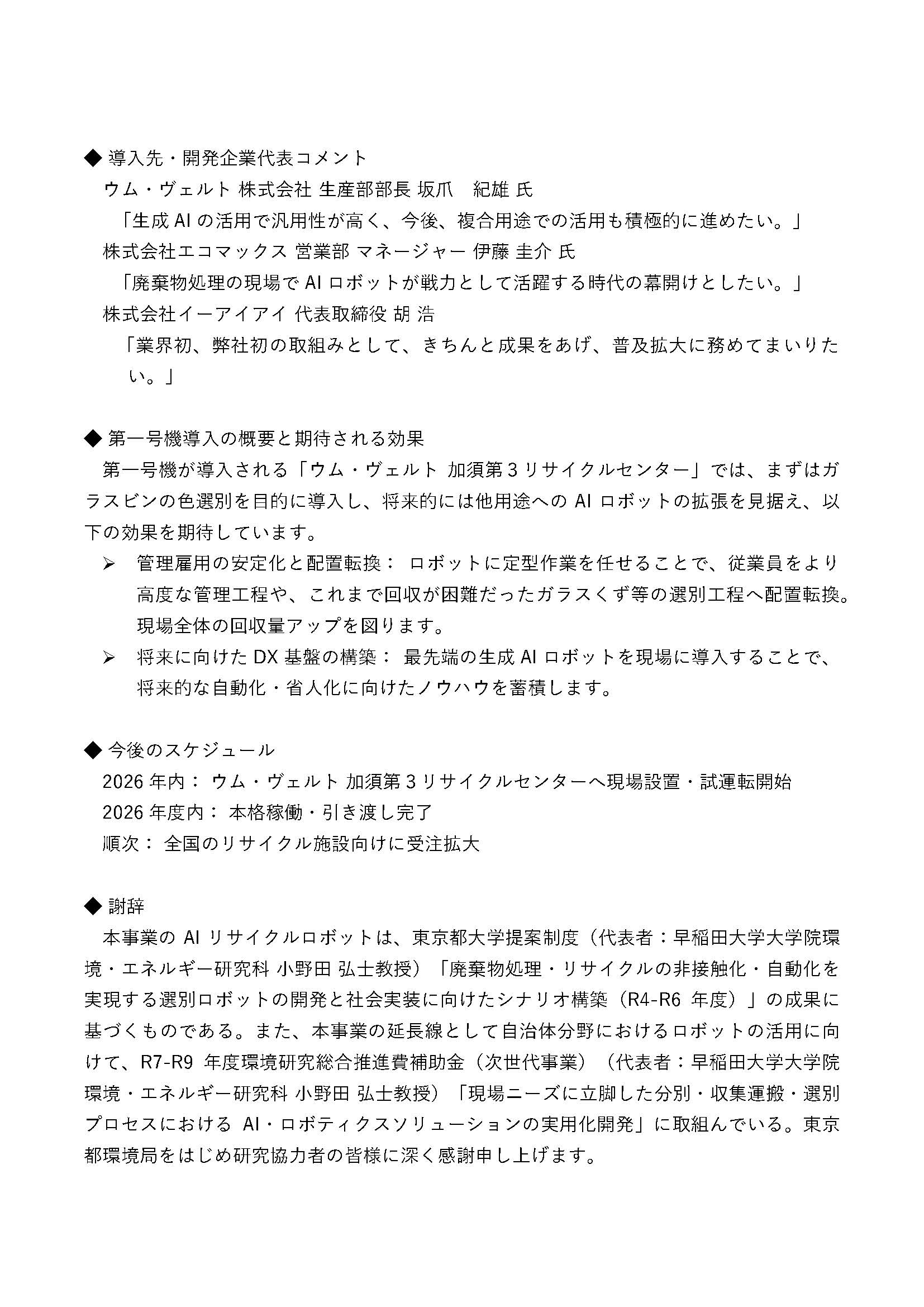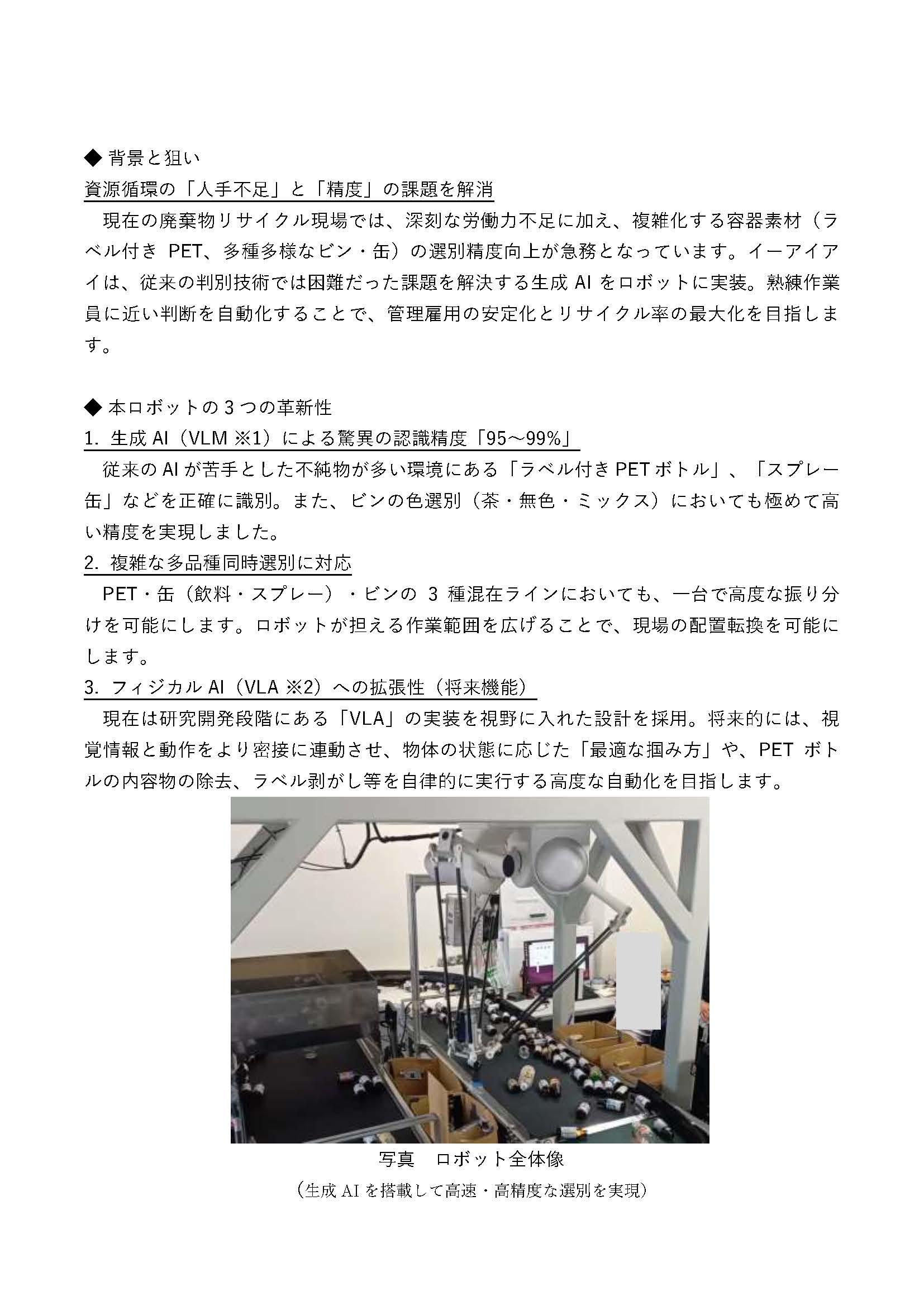 開発した業飲料容器の高度な自動選別を実現する「生成AI活用型 飲料容器高度リサイクルロボット」の