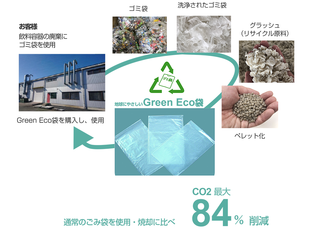 飲料容器の廃棄に使われたゴミ袋をリサイクルし、もう一度ゴミ袋に生まれ変わった商品。近年加速している「ボトルtoボトル」+業界初の【ゴミ袋toゴミ袋】を実現。